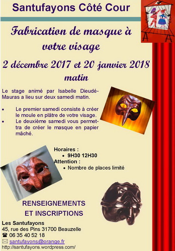 - Stage de fabrication de masque à votre visage : 2 décembre 2017 et 20 janvier 2018 au matin
