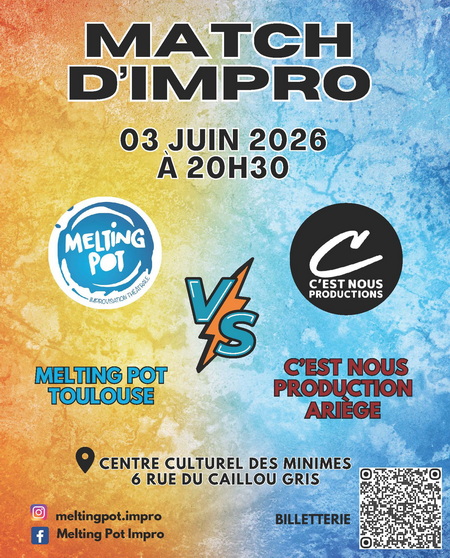 Melting Pot reçoit l’équipe de C’est nous production Ariège, pour un match d’impro !! Deux équipes, un arbitre légèrement irritable, un MC survolté : le chaos est organisé, mais l’énergie est délicieusement imprévisible. Le public rit, vote, hue l’arbitre (qui adore ça), et encourage les improvisateurs comme s’ils jouaient la finale de la Coupe du Monde de l’Imagination.