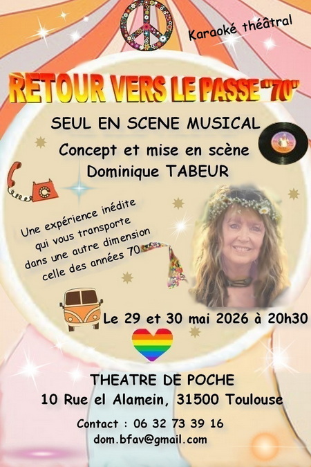 « Les années 70, Peace and love : les flash-backs du passé laissent place à une douce nostalgie. Dans ce road trip théâtral, j’embarque le public pour un voyage pas comme les autres . Une traversée sur les planches où chaque étape du périple révèle un souvenir. L’interaction avec le public en chanson devient le moteur de cette comédie invitant chacun à devenir complice du récit et acteur.Un spectacle où l’on rit, où l’on rêve, et où l’on se souvient… ensemble. »